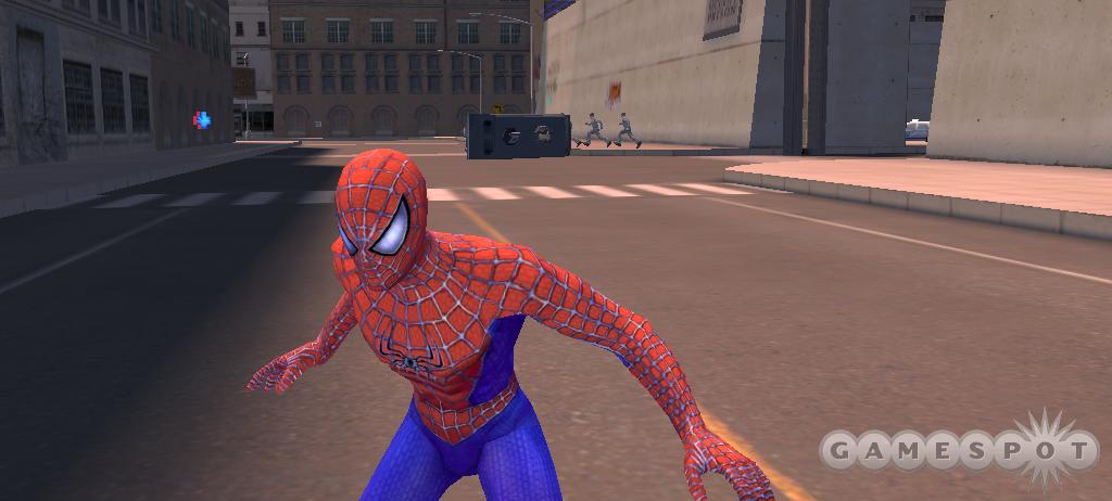 游戏开头和中间穿插点CG,,CG做的还可以,清楚的交代的剧情。我通过游戏的文件目录结构发现游戏采用的是Unreal Engine 2制作,但遗憾的是游戏并没有充分发挥UE2的效能,画面并不算出色。游戏比较全面的再现了New York的一些著名场景,如华尔街,自由女神像等,但也许是游戏场景比较大,或者是跟Console的一同制作的缘故,纹理贴图和模型质量都比较差,如除了蜘蛛人和BOSS级人物以外的角色,车辆等模型都比较粗糙。游戏中也没有什么动态光影效果。在这3D化框架的城市中虽然蜘蛛侠有很大的自由度,任意攀爬跳跃盘旋于任意地点,但行动的自由度近还是没有标榜的那样开阔,和GTA还是有段差距,在建筑边缘和顶部经常容易卡住或莫名的悬空,对于室外建模的层次感没有朦胧渲染,使得城市整理的画面表现度略为失真和简陋!游戏用高效率的引擎做比较简单的画面,系统要求比较低。